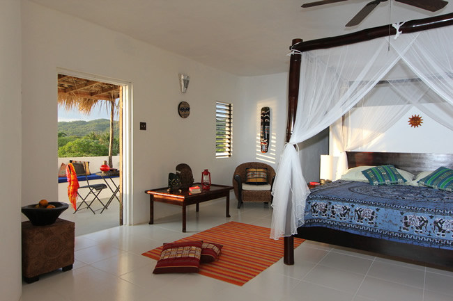 The master bedroom sits in the middle of the second floor with an expansive sun deck on one side and a shaded roof terrace on the other side. The blue and yellow bedrooms are located on either side of the main floor with the living room, dining room, and kitchen located in the middle. The red bedroom is located right off of the enclosed courtyard. All bedrooms are en suite and have king size beds.
