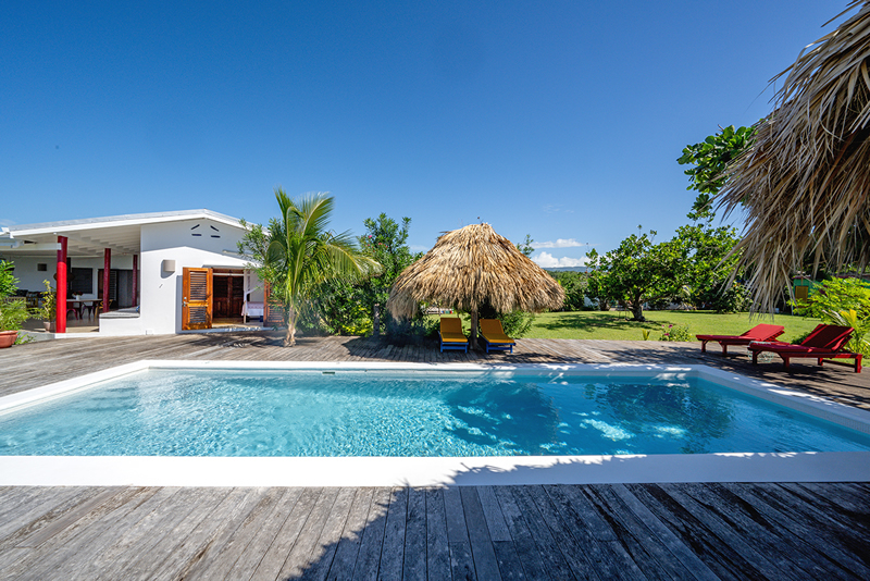 This newly polished villa offers 3 ensuite bedrooms (2 with outdoor showers), living area, TV room, 3 al fresco dining areas, a spacious covered verandah, pool and pool deck with large thatched gazebo with dining table, two small thatched huts, hammock under a large sea grape tree and a hidden scenic overlook area.