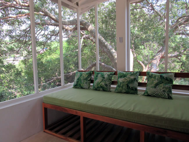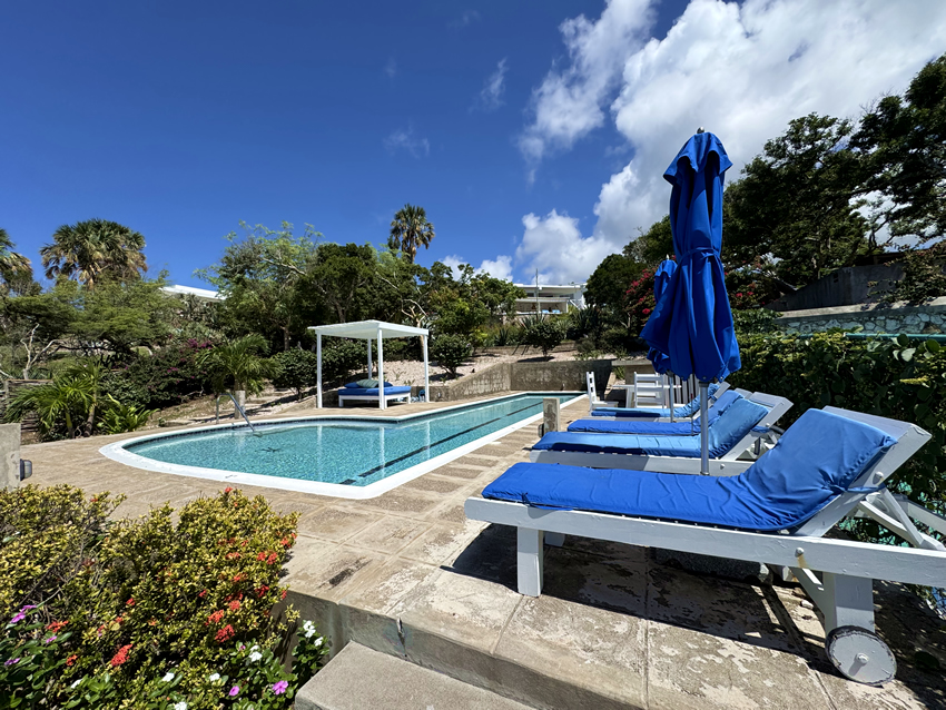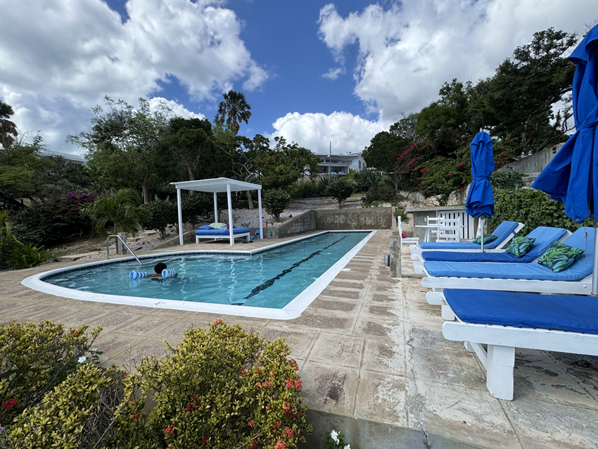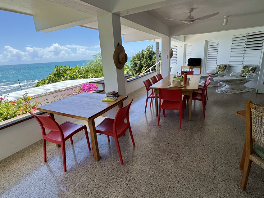 The villa itself has direct access to the beach, with a beautiful natural garden with a large pool and sitting area under the large lignum vitae trees, plus a peaceful covered portico perfect for lounging, and playing games. Even when the days are hot, there is always a nice breeze that keeps the rooms and outdoor areas cool and comfortable.