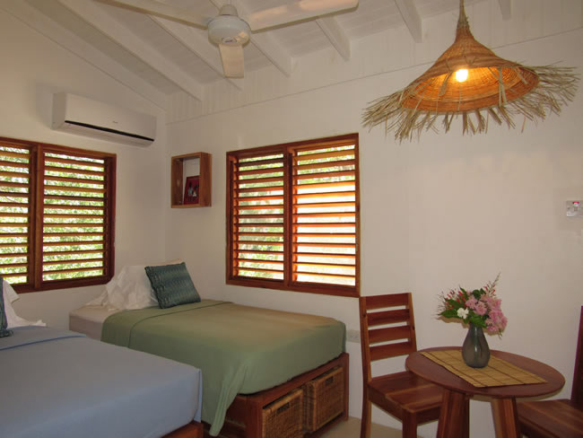 Garfield Cottage, a separate cottage located just behind the main villa has been gorgeously restored into the perfect tiny house. It offers 2 bedrooms, one with two single beds which can be converted into a king-size bed, and a second bedroom offering a single bunk bed and a small table with two chairs. There is a kitchenette, bathroom, a screened in porch for each bedroom and lovely deck. This is only rented with the main villa to assure your privacy during your stay. With the addition of Garfield Cottage Villa Hikaru now comfortably houses 12!