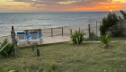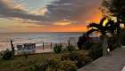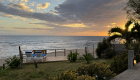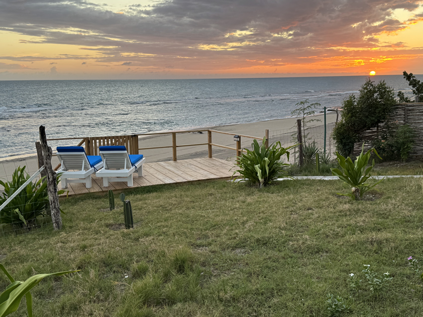 A winding path leads to a shaded wooden deck, thoughtfully furnished with an additional dining table and built-in cushioned benches—ideal for leisurely meals or quiet moments surrounded by nature. Perched right at the water’s edge, the new beach deck is a standout feature, providing the perfect vantage point to watch the waves roll in and take in breathtaking sunset views.
