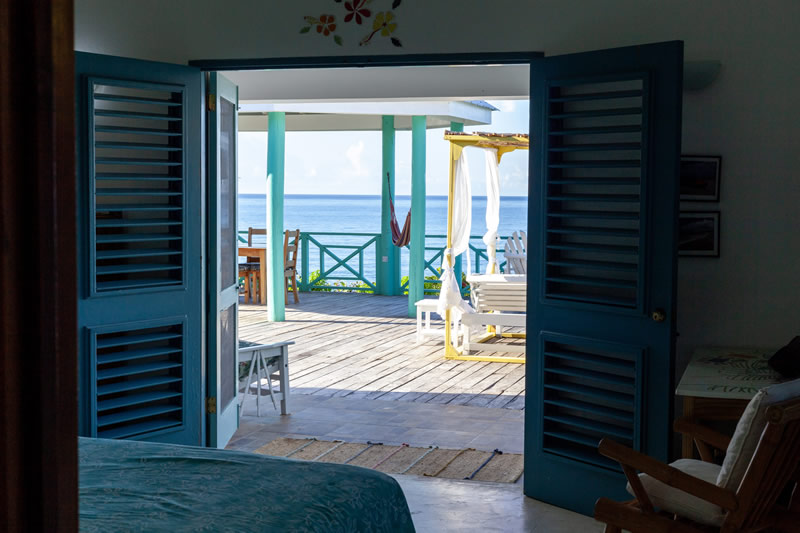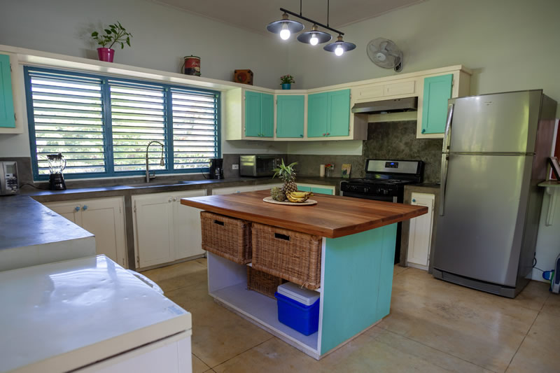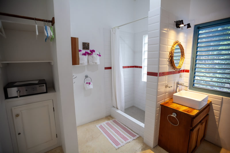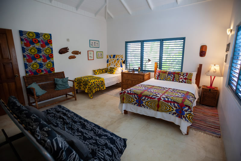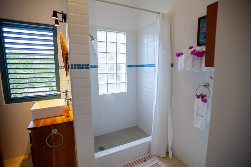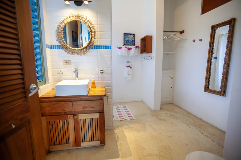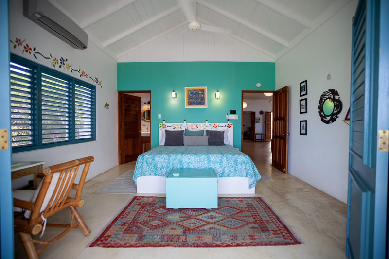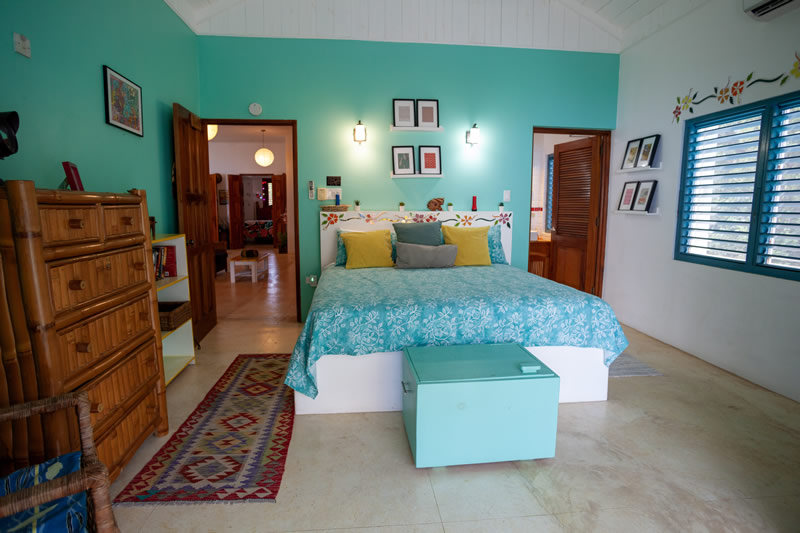 All bedrooms have AC. Three bedrooms have private bathrooms. Two en suite bedrooms have king-sized beds and double doors opening out onto the sun deck and sea view. The 3rd en suite bedroom has a queen and a single bed plus a futon. The 4th bedroom has a double bed and the 5th bedroom has a single bed. Both the 4th and 5th bedrooms share a bathroom located just off of the kitchen.