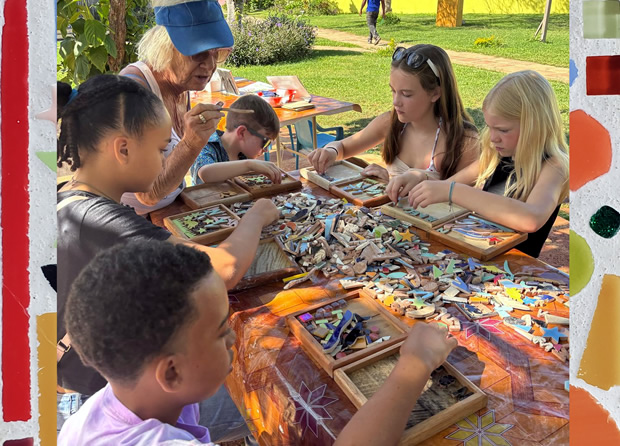 Book a mosaic tile workshop with Ronda, a professional Montessori preschool teacher. All materials are provided for you to craft your own cedar-framed mosaic-tiled trivet.