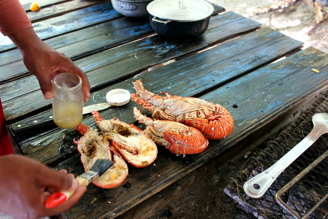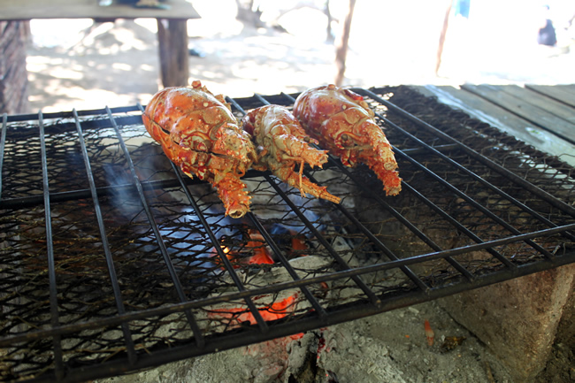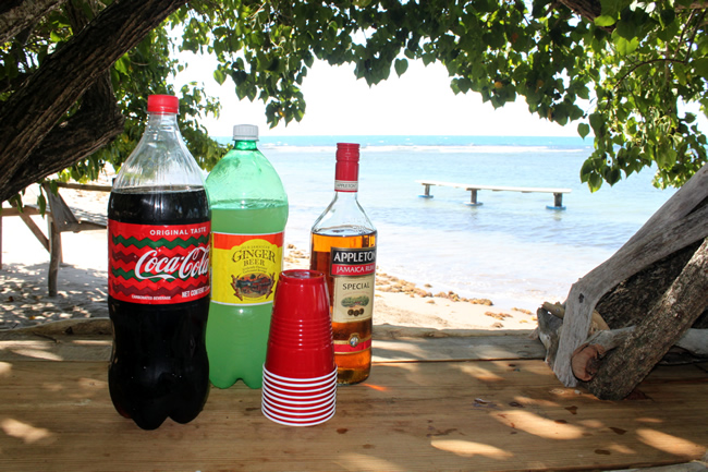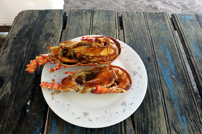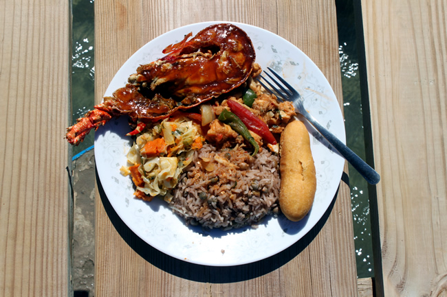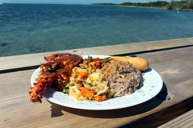 The menu includes grilled lobster, crab served on a grape leaf, steamed fish, vegetables and rice. Special diets can be accommodated upon request. Beverages include Red Stripe beer, rum punch, water, Appleton rum and Coke. The above food and beverages are included in the cost of the trip.